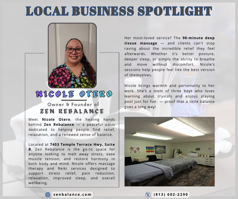 Located at 7403 Temple Terrace Hwy, Suite B, Zen Rebalance is the go-to space for anyone looking to melt away stress, ease muscle tension, and restore harmony in both body and mind. Nicole offers massage therapy and Reiki services designed to support stress relief, pain reduction, relaxation, improved sleep, and overall wellbeing.